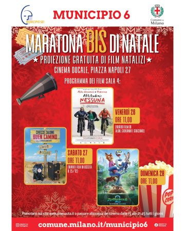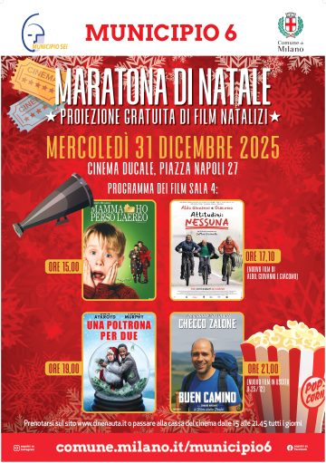 In occasione delle festività natalizie, Ducale Multisala e Municipio 6 offrono al pubblico una maratona di film dedicata alle feste ad ingresso gratuito. Nella giornata del 31 dicembre un ricco programma accompagnerà gli spettatori verso l’anno nuovo: 15.00: Mamma ho perso l’aereo 17.10: Attitudini: nessuna 19.00: Una poltrona per due